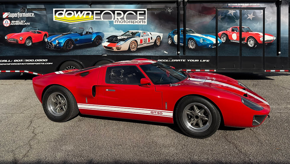 A great opportunity to get into a low mileage and well built GT40 Mk1! Power comes a Roush 427 IR egnine rated at over 570hp and topped off with 8-stack fuel injection. That power is transfered to a very hard to come by ZF 5-speed transaxle. The exterior is finished in bright red with solid white twin and sill stripes for a classic look. Rolling stock is a set of BRM style 15" wheels and tires.