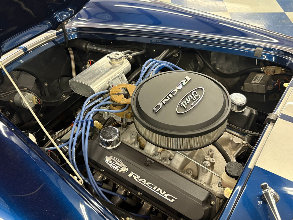 SPO914 features power from a Ford Performance 392 stroker crate engine backed by a Tremec 5-speed manual transmission. Finished in Indigo blue and accented by Titanium Silver stripes makes for a stunning but class look! Other features include a leather wheel, 15" Halibrand style wheels, tonneau cover, soft top and sidepipe heatshields by Olthoff Racing.